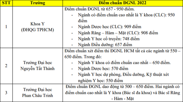 Tham khảo điểm chuẩn ĐGNL HCM của các trường Y dược hoặc đào tạo ngành Y dược năm 2022 dưới đây: